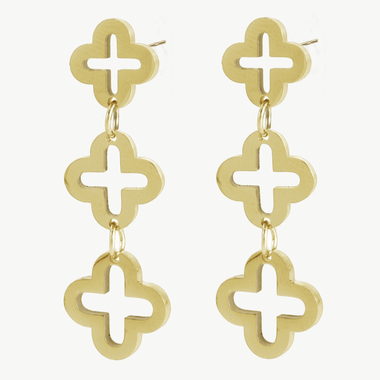 Drei kleine vierblättrige Kleeblätter schmücken dieses Schmuckstück und sorgen für einen süßen, stilvollen Look. Aus robustem Edelstahl gefertigt und mit 14 Karat vergoldet, sind sie langlebig und angenehm leicht. Mit nur 3,2g und einer Länge von 3,5 cm sind die leicht am Ohr.